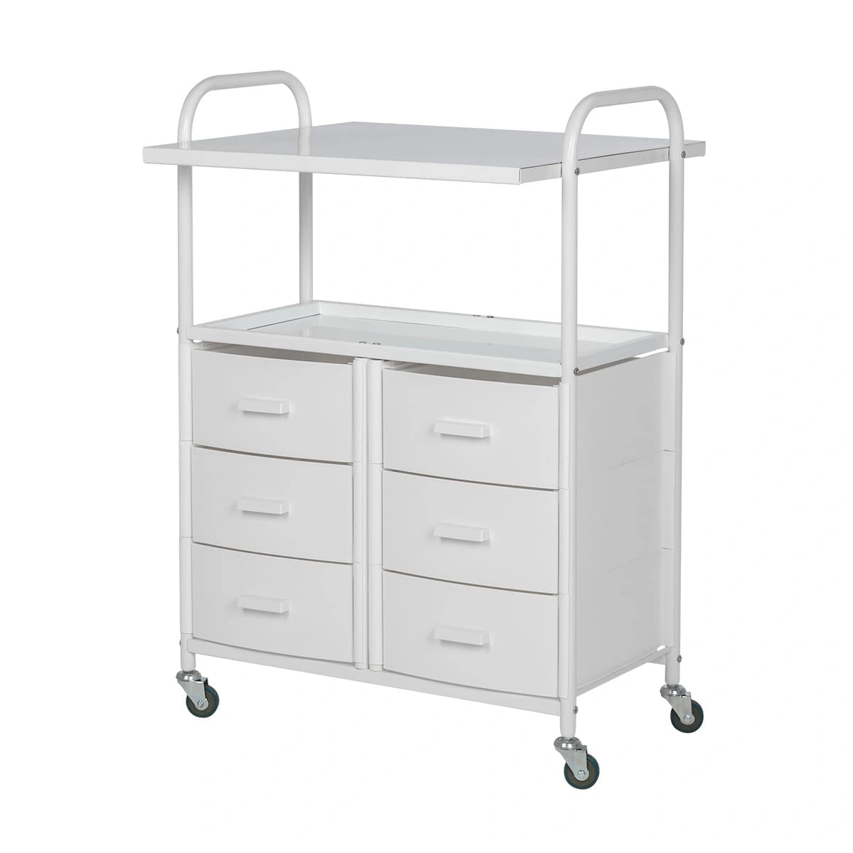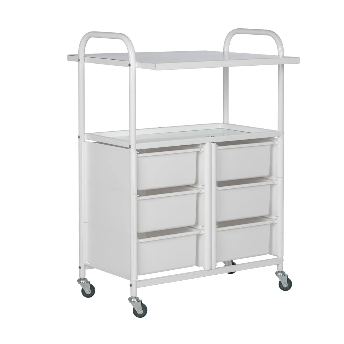 Для инструментов, аксессуаров и расходных материалов достаточно места в шести выдвижных ящиках. Полки можно использовать как для необходимых приспособлений, так и для установки небольших аппаратов. Несомненным плюсом косметологического оборудования являются встроенные маневренные колесики. Мастер без особых усилий может перемещать косметологическую тележку по рабочей зоне.