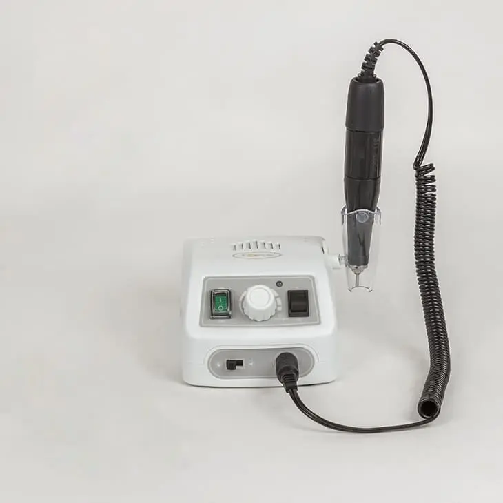 Устройство – блок питания с подсоединенной ручкой-фрезером. В зависимости от этапа работы и зоны обработки, меняется фреза, которая крепится в цанговом зажиме за считанные секунды. Специальный зажим плотно фиксирует инструмент в наконечнике и не допускает ее проворачивания во время рабочего процесса. Сменные фрезы удобно расставить в специально предусмотренном месте в корпусе блока. Маникюрное оборудование складывается в компактную сумку, которую можно взять с собой. В комплекте есть ножная педаль, выполняющая функцию выключения и выключения.