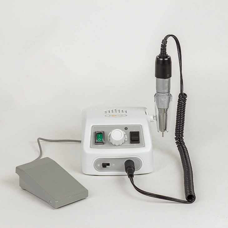 Маникюрный аппарат состоит из блока питания и ручки-фрезера. Для сменных фрез есть отведенное место в верхней части блока, чтобы нужный инструмент был всегда под рукой. Замена фрезы не требует особых усилий благодаря удобному цанговому зажиму. Регулировать скорость и направление вращения можно с передней панели блока. При необходимости устройство можно включить или выключить с помощью удобной педали. Маникюрное оборудование складывается в компактную сумку, которую можно взять с собой.