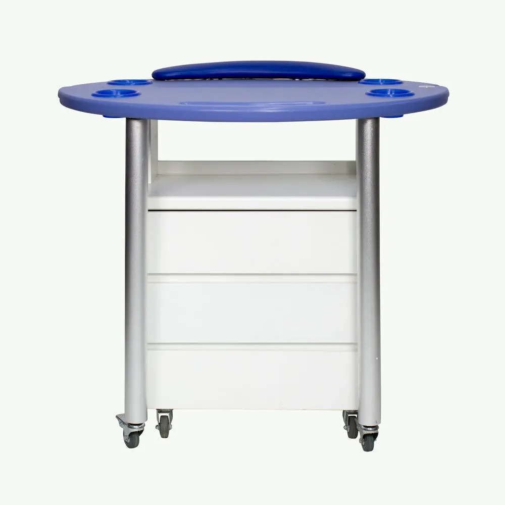 Стол маникюрный МД-9007 (раздвижной) с вместительной тумбой на колесах и хромированными ножками. Он позволяет максимально использовать пространство помещения, что очень важно при минимальной площади рабочего кабинета или для работы на дому. Круглая столешница состоит из двух частей, которые соединены металлическим креплением. В каждой части предусмотрено по два отверстия с пластиковыми емкостями для хранения различных расходных материалов, аксессуаров и прочих рабочих принадлежностей. Для изготовления столешницы применяется ДСП с ламинированным покрытием приятного синего цвета.