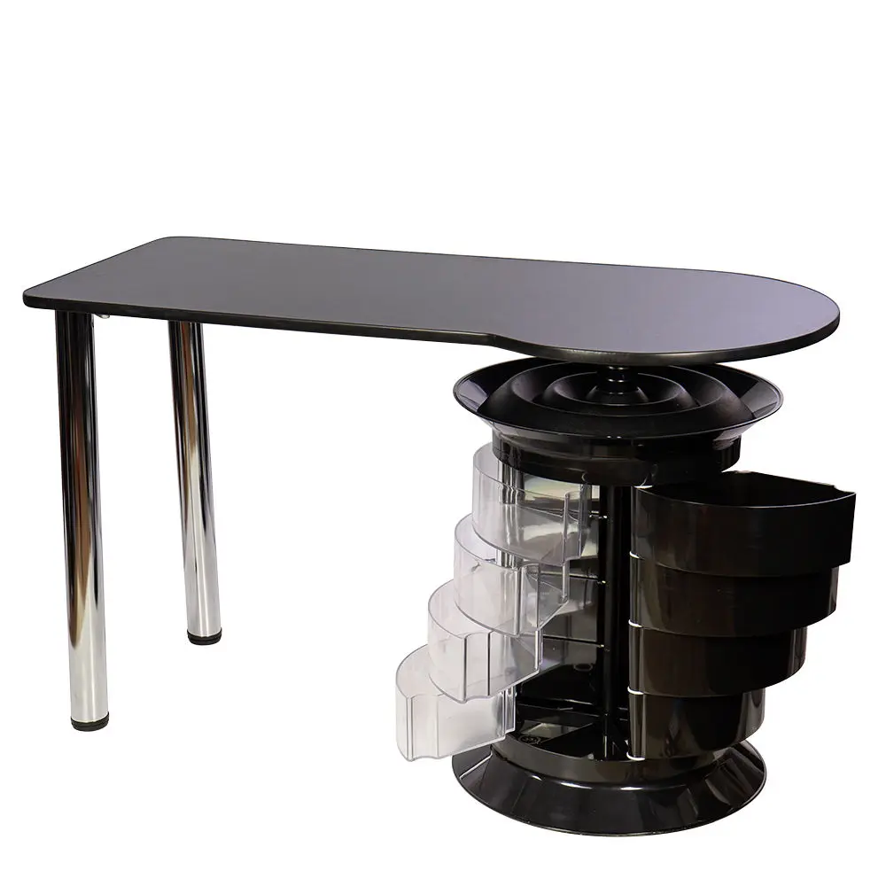 Тумба состоит из 12 выдвижных ящиков, где поместятся приспособления и расходные материалы мастера. Четыре прозрачных ящика можно использовать для инструментов, часто используемых в работе. Функция вращения тумбы поможет быстро найти необходимые принадлежности. Над тумбой есть практичная полочка, разработанная для хранения лаков. Ширина столешницы позволит установить сопутствующее оборудование.