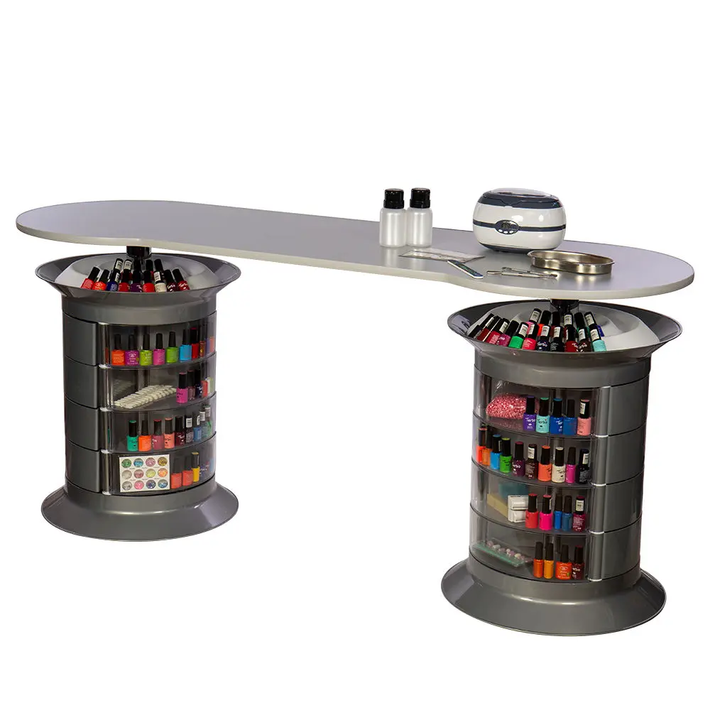 В тумбах 24 ящика, в которых мастер сможет хранить абсолютно все инструменты и расходные материалы. В каждой тумбе есть четыре прозрачных ящичка. Так мастер сможет найти необходимые принадлежности еще быстрей. Крышки над тумбочками разработаны специально для хранения лаков.