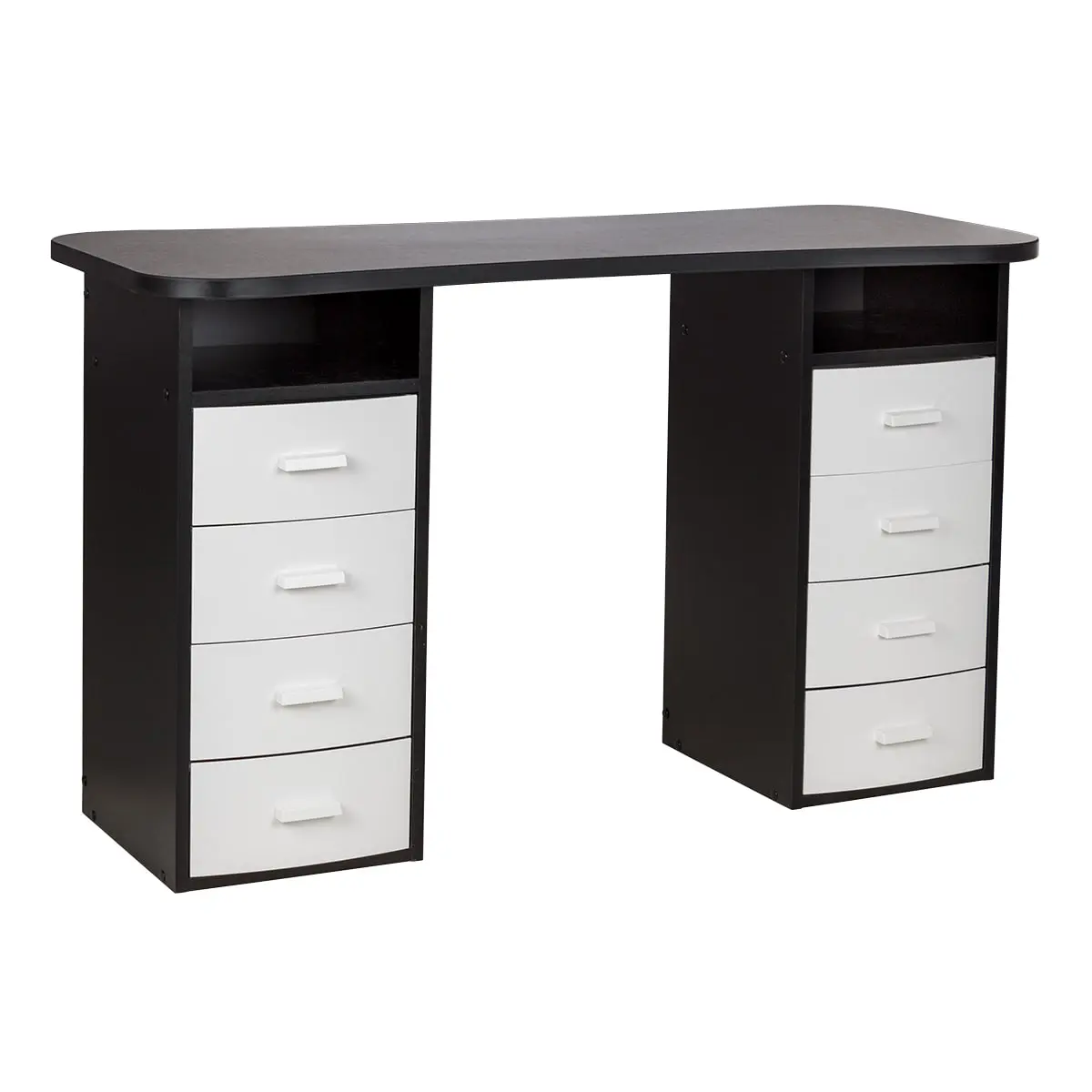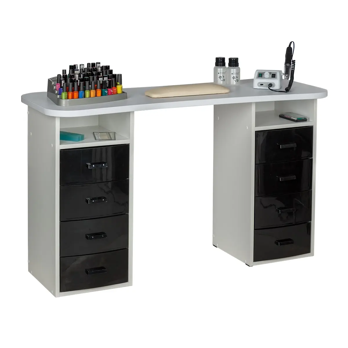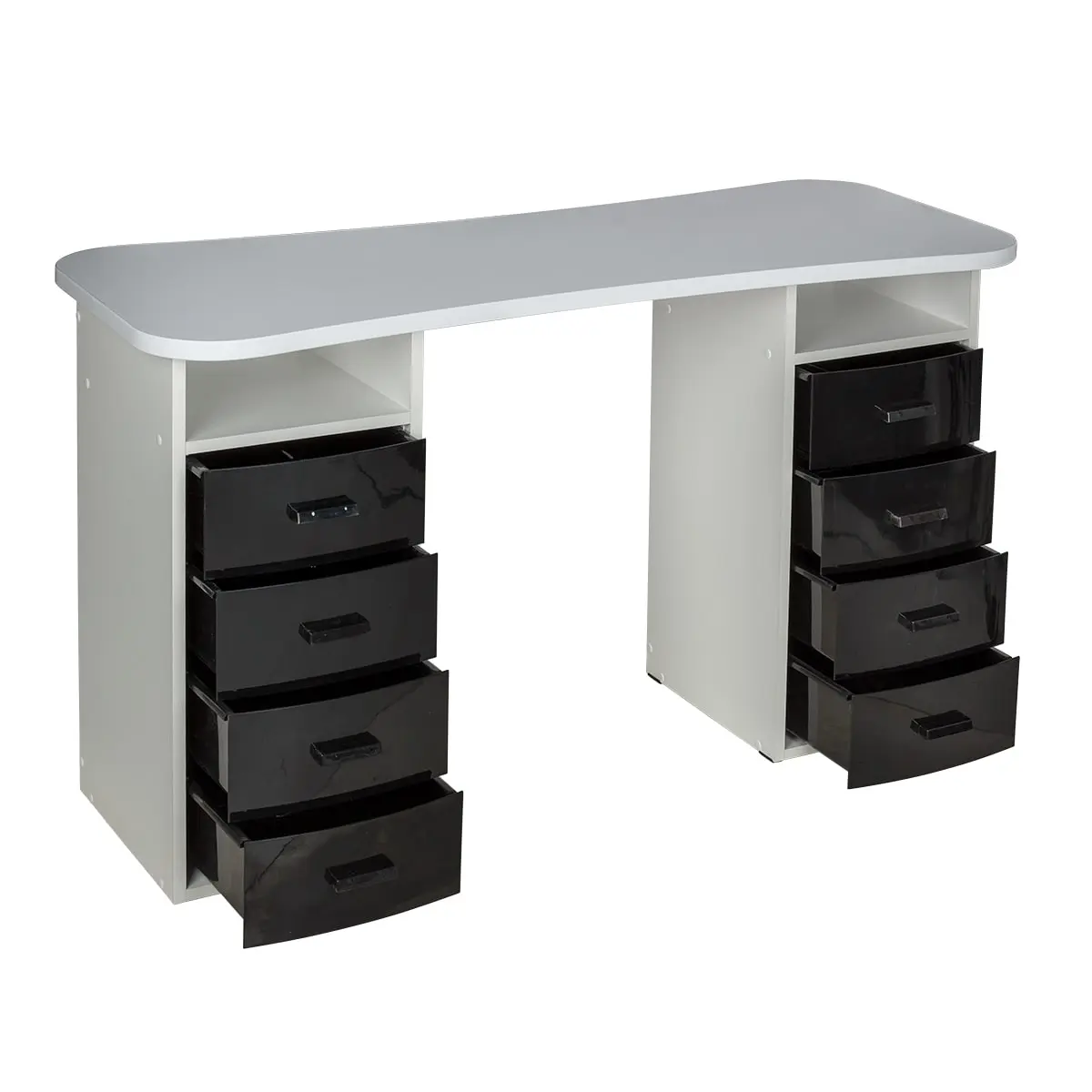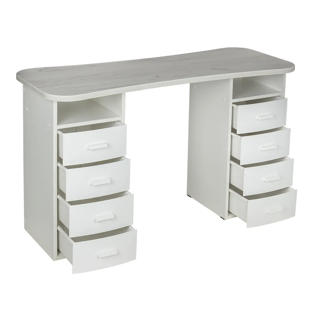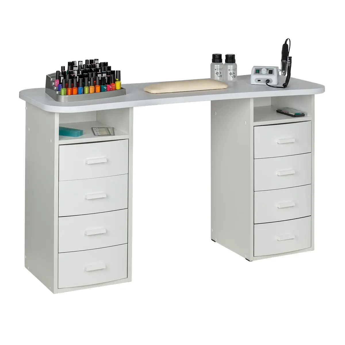 Столешница имеет плавный изгиб посередине, чтобы обеспечить удобный доступ к ноготкам клиентов. На широких сторонах столешницы мастер может поставить необходимые для работы инструменты, аппараты и материалы. Маникюрный стол оснащен двумя тумбами, в которых есть и открытые полки, и выдвижные ящики. Здесь достаточно места для приспособлений, которые временно не используются.