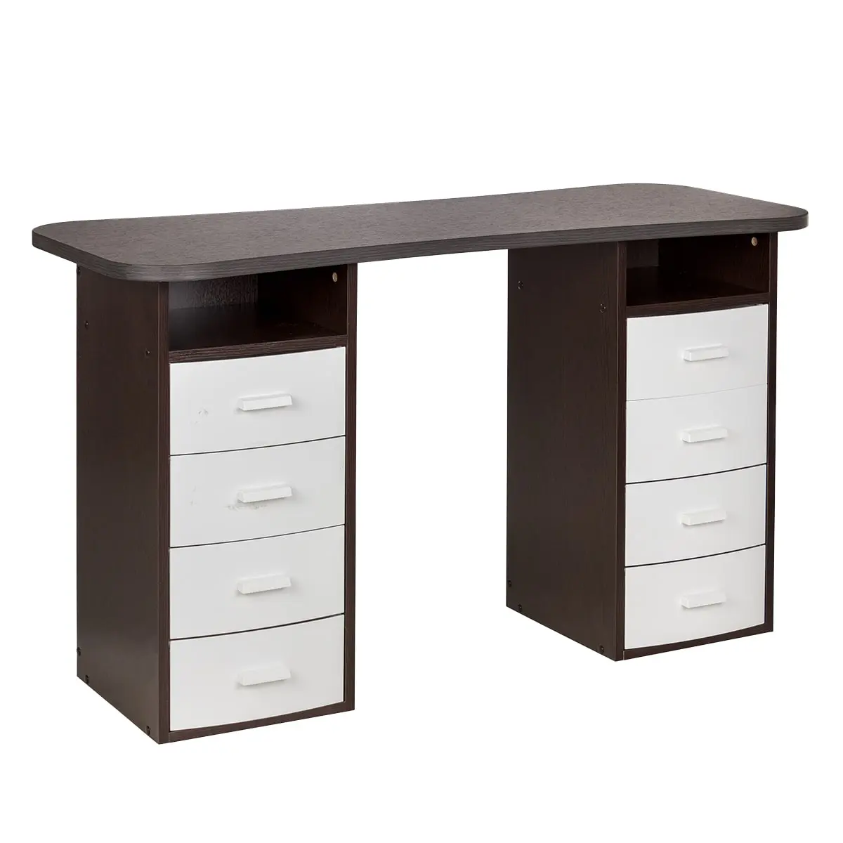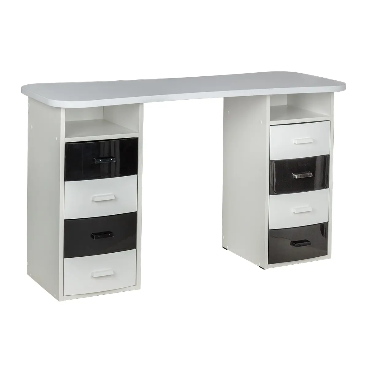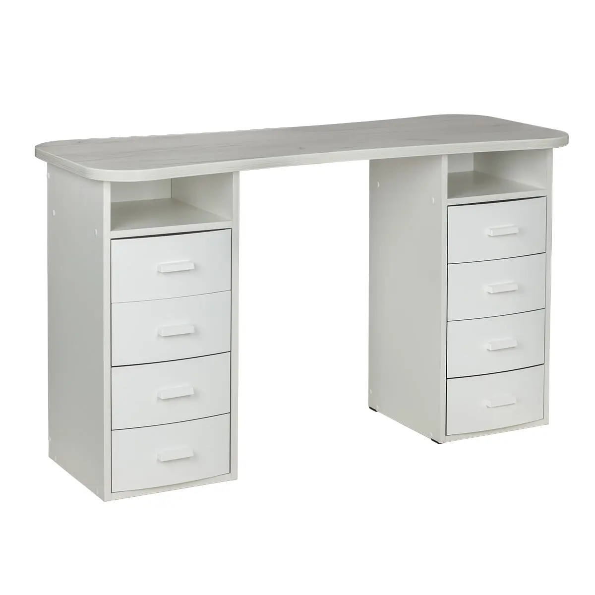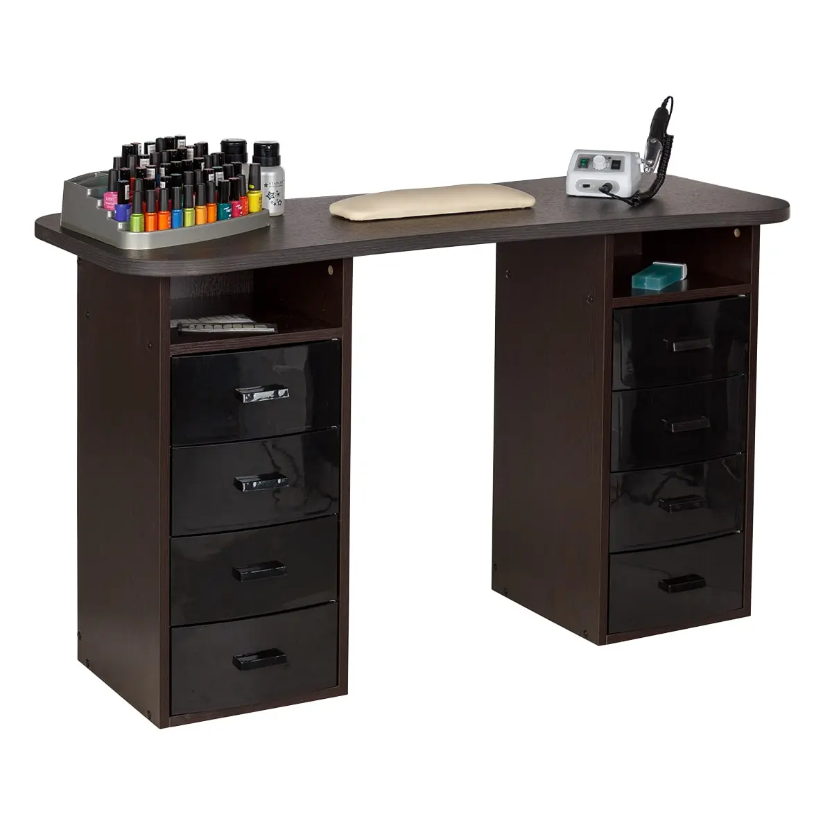 Столешница имеет плавный изгиб посередине, чтобы обеспечить удобный доступ к ноготкам клиентов. На широких сторонах столешницы мастер может поставить необходимые для работы инструменты, аппараты и материалы. Маникюрный стол оснащен двумя тумбами, в которых есть и открытые полки, и выдвижные ящики. Здесь достаточно места для приспособлений, которые временно не используются.