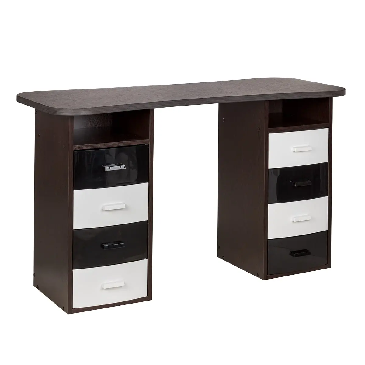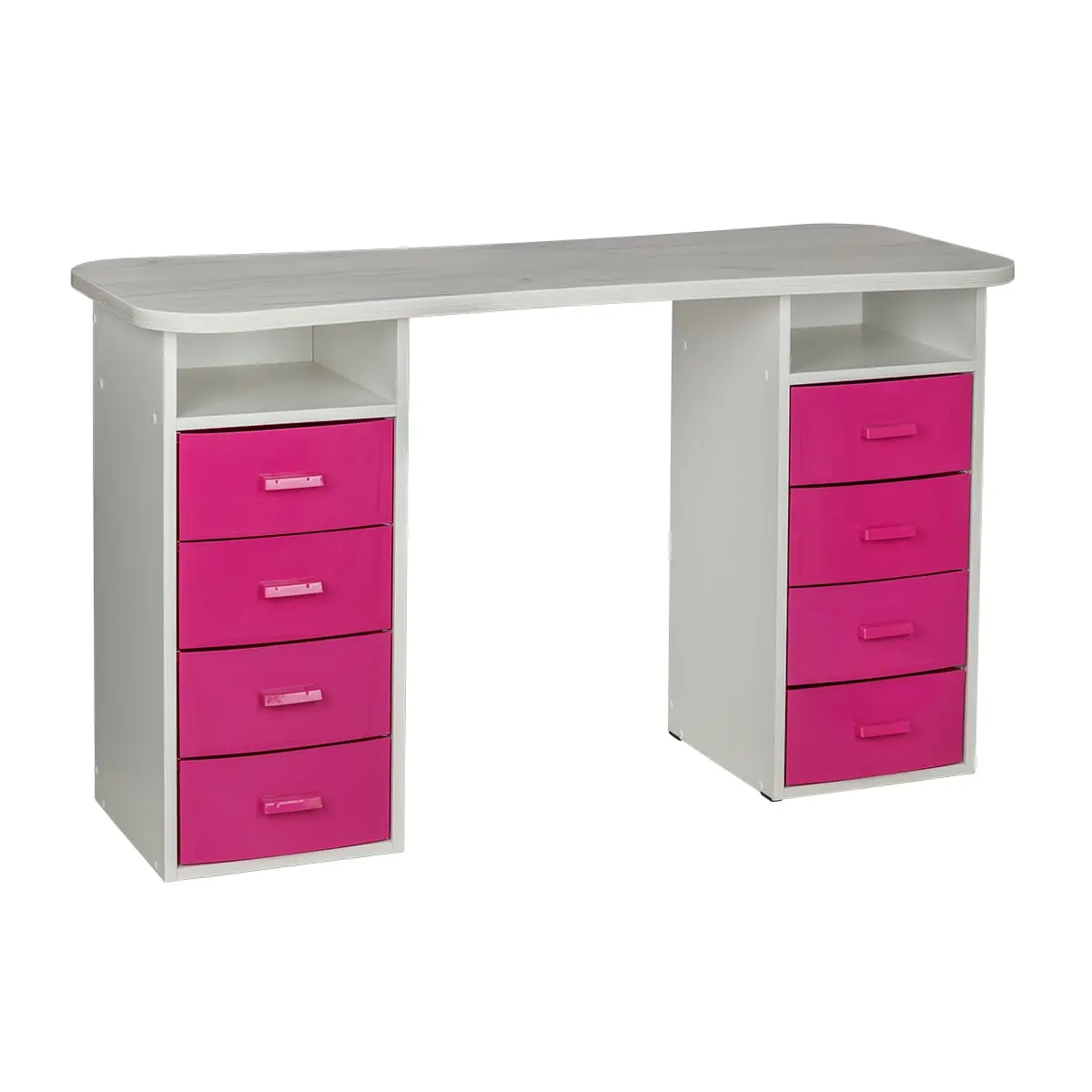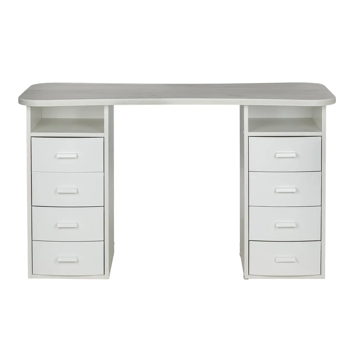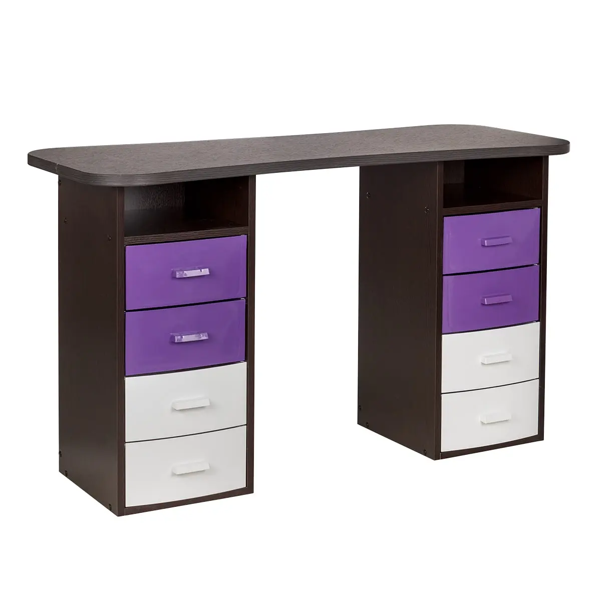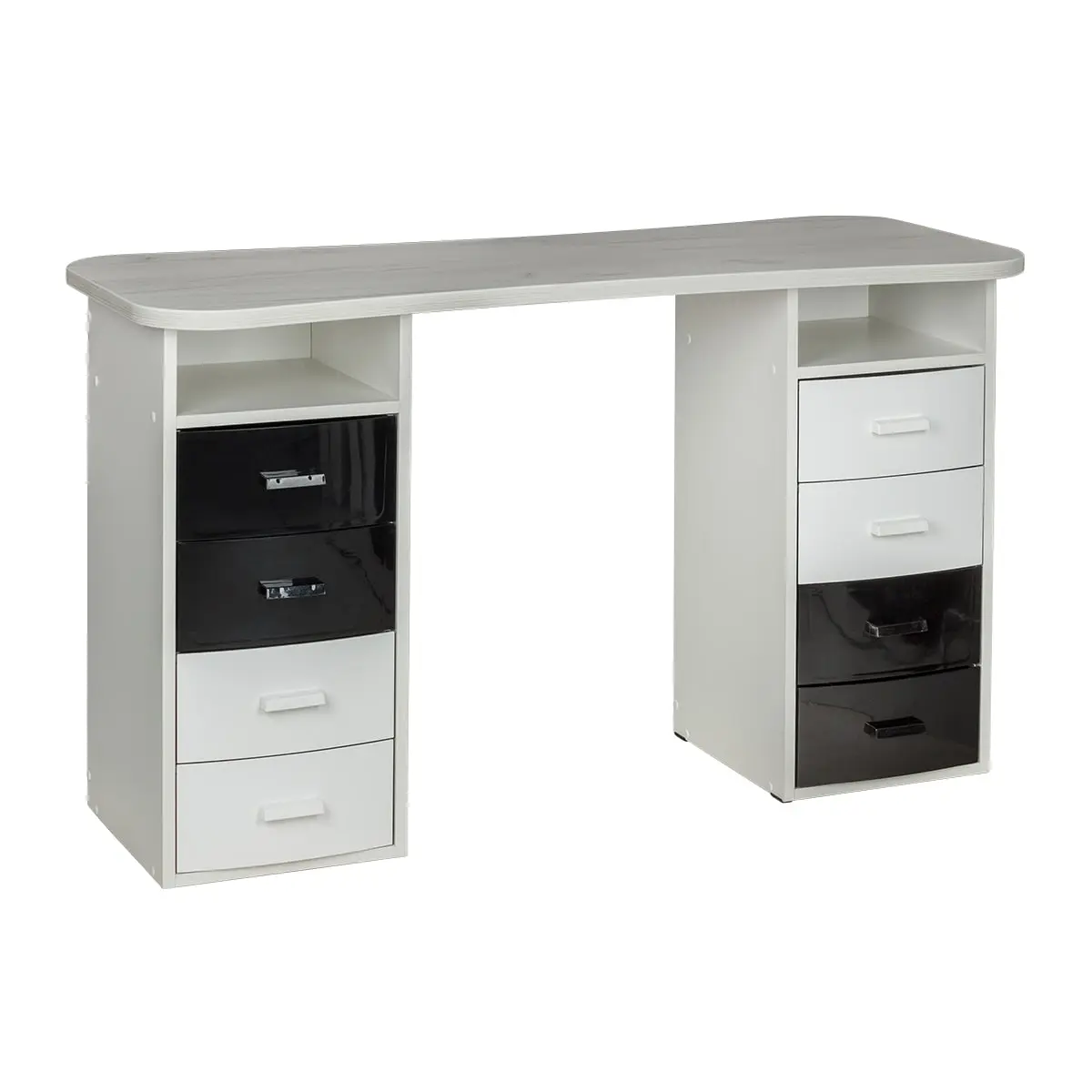 Столешница имеет плавный изгиб посередине, чтобы обеспечить удобный доступ к ноготкам клиентов. На широких сторонах столешницы мастер может поставить необходимые для работы инструменты, аппараты и материалы. Маникюрный стол оснащен двумя тумбами, в которых есть и открытые полки, и выдвижные ящики. Здесь достаточно места для приспособлений, которые временно не используются.