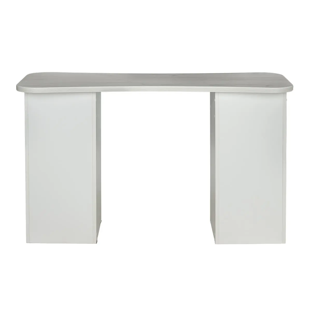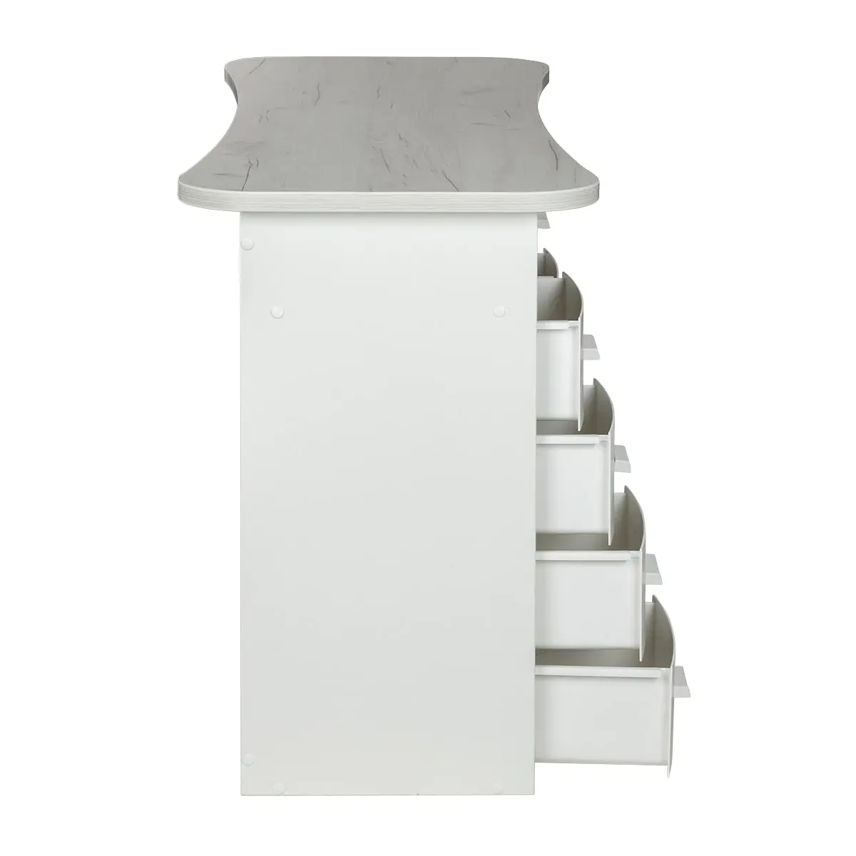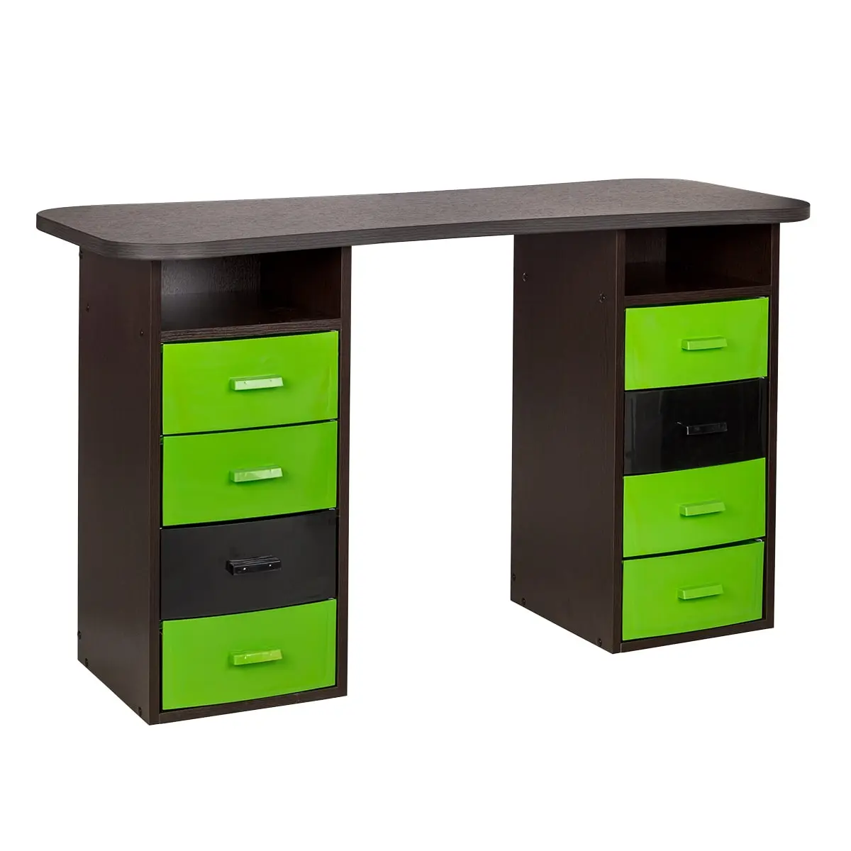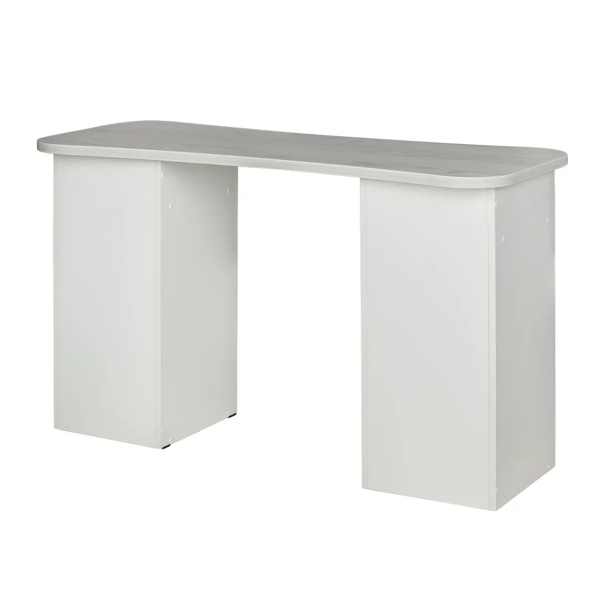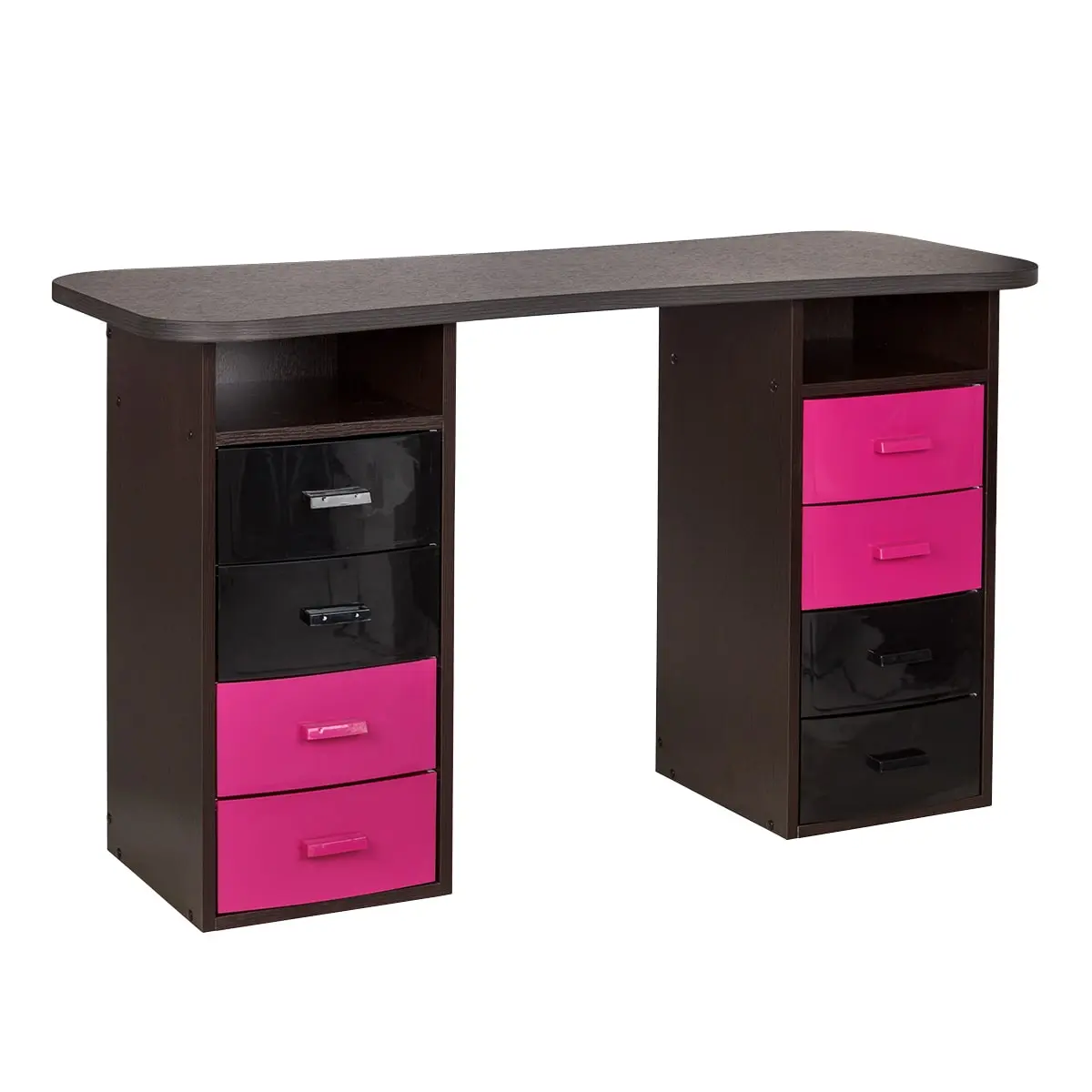 Столешница имеет плавный изгиб посередине, чтобы обеспечить удобный доступ к ноготкам клиентов. На широких сторонах столешницы мастер может поставить необходимые для работы инструменты, аппараты и материалы. Маникюрный стол оснащен двумя тумбами, в которых есть и открытые полки, и выдвижные ящики. Здесь достаточно места для приспособлений, которые временно не используются.