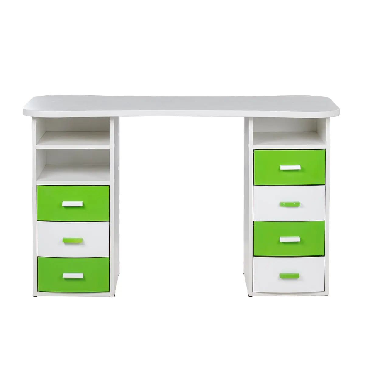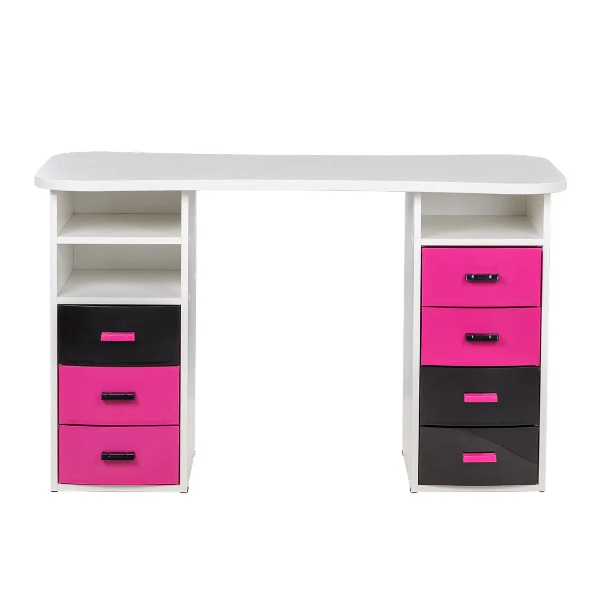 Корпус тумбы, полки и столешница маникюрного стола выполнены из ЛДСП высокого качества. Кромка из ПВХ надежно защищает торцы маникюрного стола от сколов и проникновения влаги. Специальные подпятники не допустят царапин на полу. Ящики из прочного пластика не бояться легкого механического воздействия и влияния моющих средств. Можно заказать разные комбинации расцветок ящиков из доступных цветов.