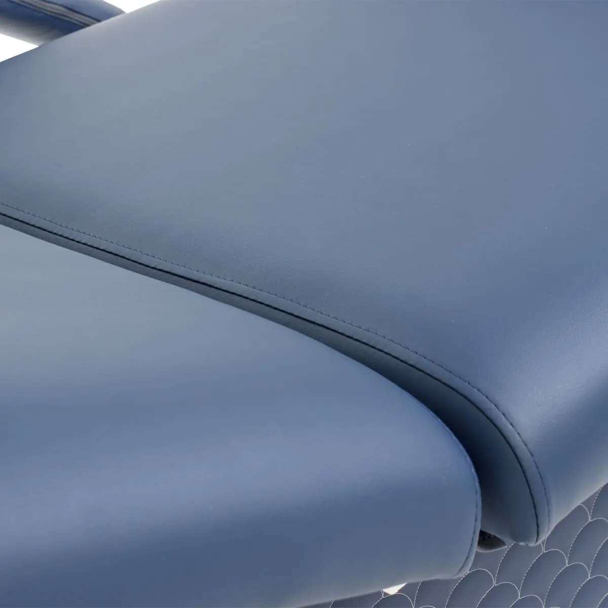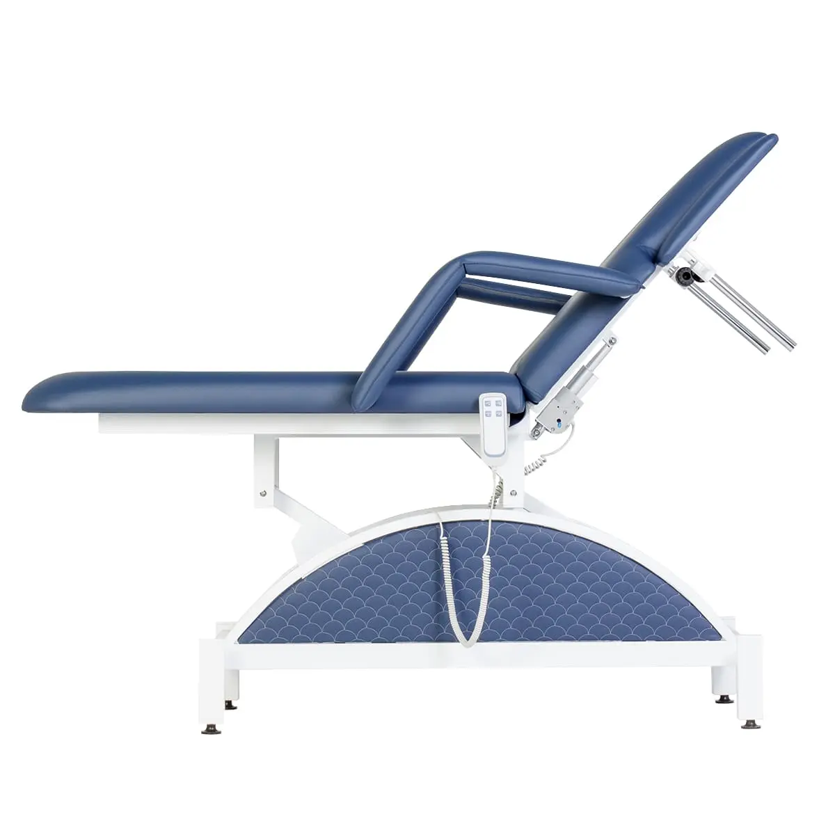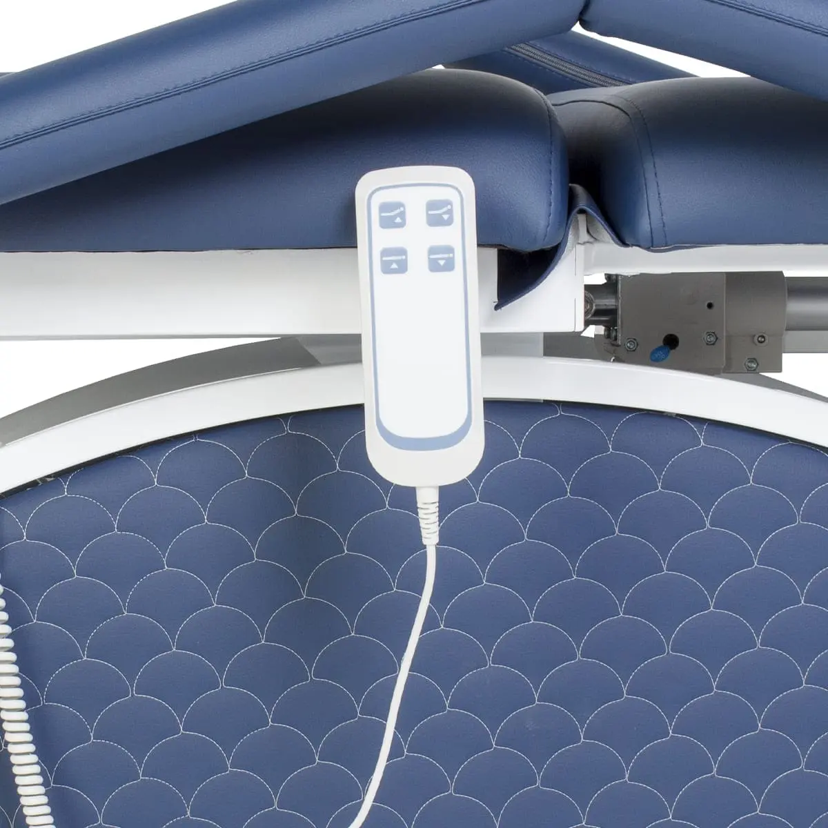 Кушетка разделена на два мягких сегмента, положение которых регулируется. С помощью двух встроенных электромоторов можно дистанционно регулировать угол наклона спинки и высоту кушетки. В комплект поставки входит удобный пульт управления электроприводом. Каркас и основание из металла с защитным покрытием.
