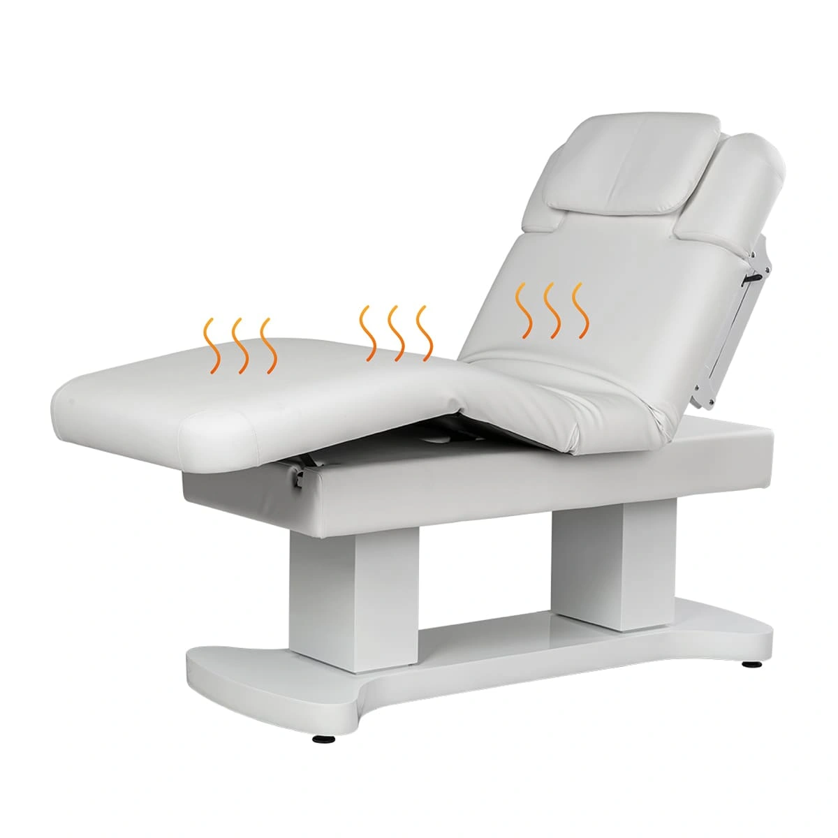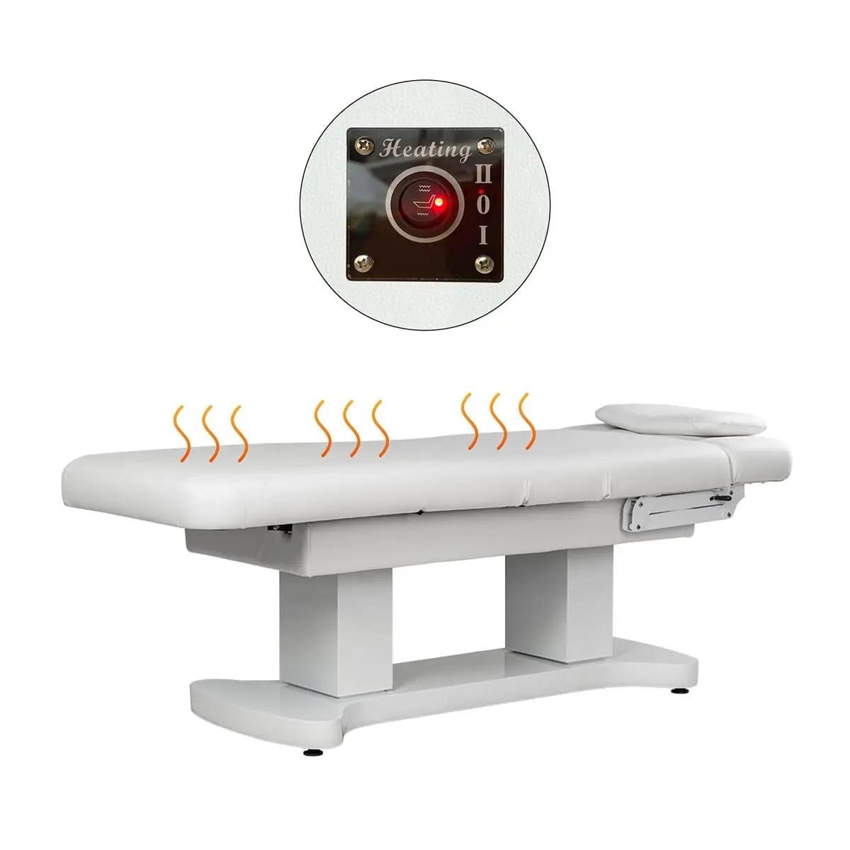 Электроподогрев ложа обеспечивает комфорт и удобство пациента во время проведения процедуры. После нажатия кнопки включения обогрева (красный индикатор/зеленый индикатор) температура начнет повышаться. Когда с комнатной температуры она достигнет максимального значения, то сработает защитный механизм, температура медленно снизится примерно до 35 градусов, а затем снова медленно нагреется до 42 градусов.
