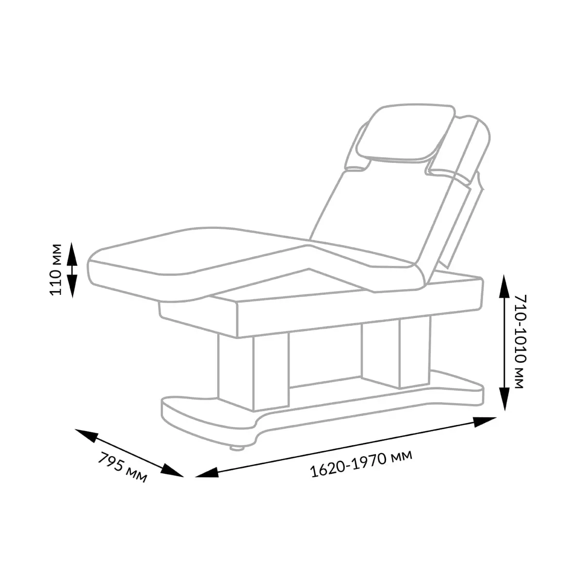 Каркас кушетки оснащен двумя колоннами, это обеспечивает равномерное распределение нагрузки и устойчивость кушетки. Высота регулируется с помощью двух синхронизированных электромоторов, что добавляет надёжности и увеличивает срок службы.