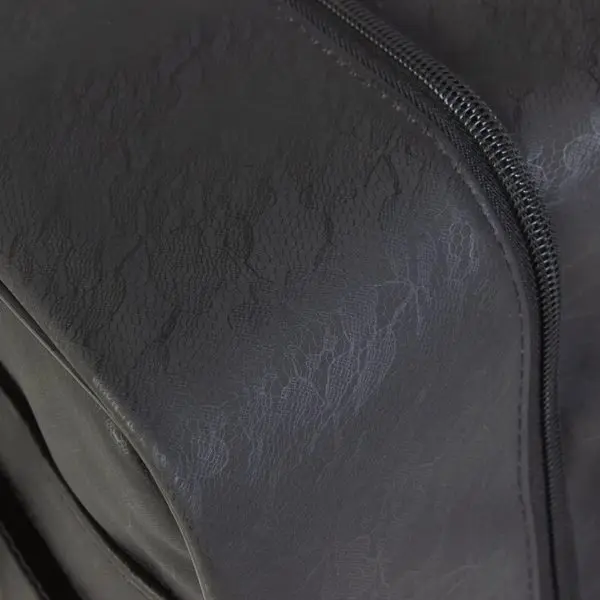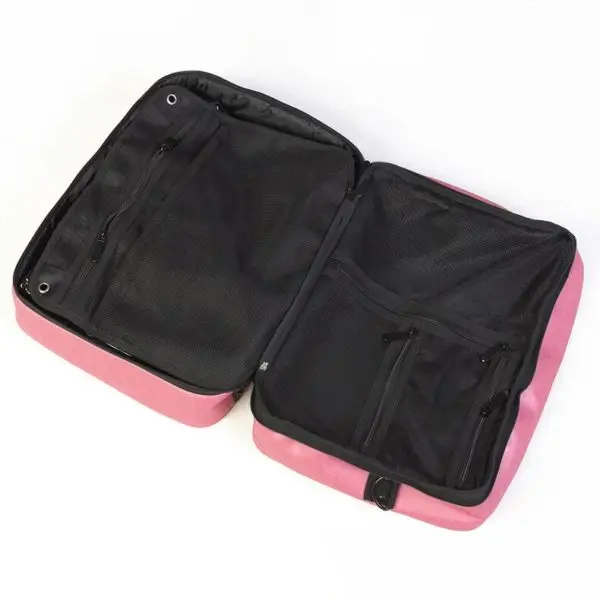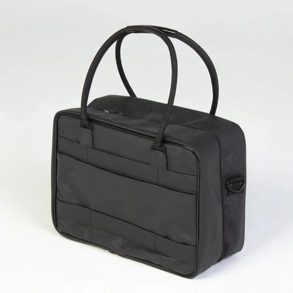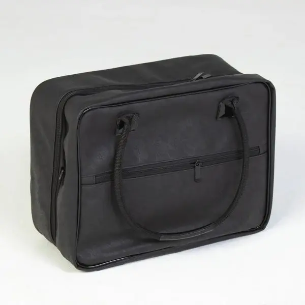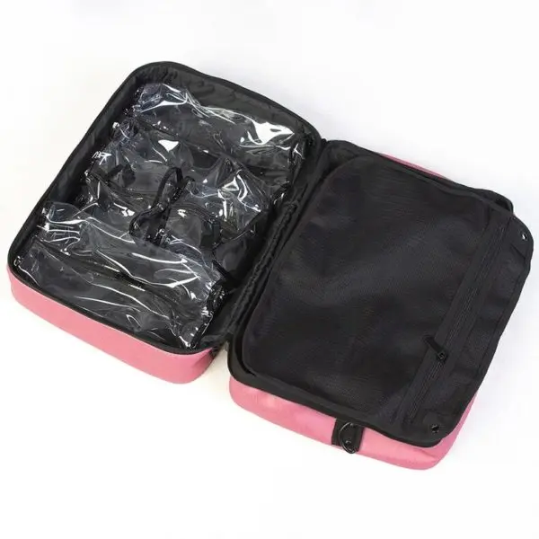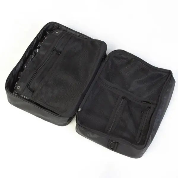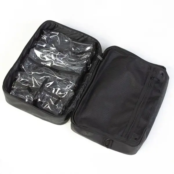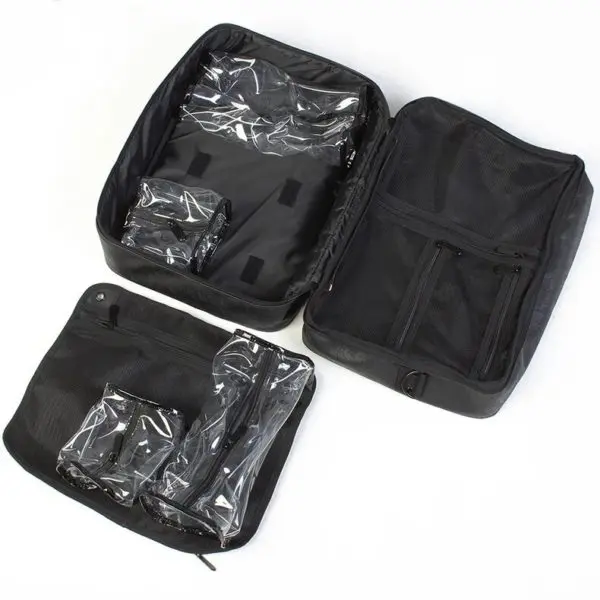Внутри сумки просторные отделения, разделенные съемным карманом на молнии. Первая половина саквояжа - прозрачные ячейки, во второй половине карманы из сетки. Благодаря такой системе хранения все приспособления находятся на виду у мастера, благодаря чему экономится время на поиске нужного средства. В закрытом виде содержимое не просыпается и не деформируется. Для удобной транспортировки в сумке предусмотрен ремень и практичная ручка.