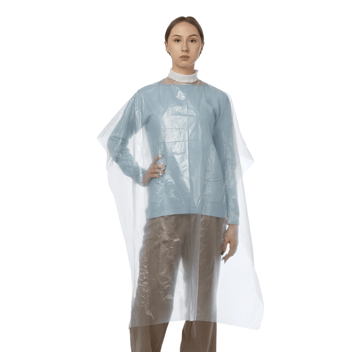 Пеньюар стандарт из полиэтилена может применяться в парикмахерской сфере во время выполнения процедуры стрижки, окрашивания или химической завивки волос для защиты кожи и одежды клиента.