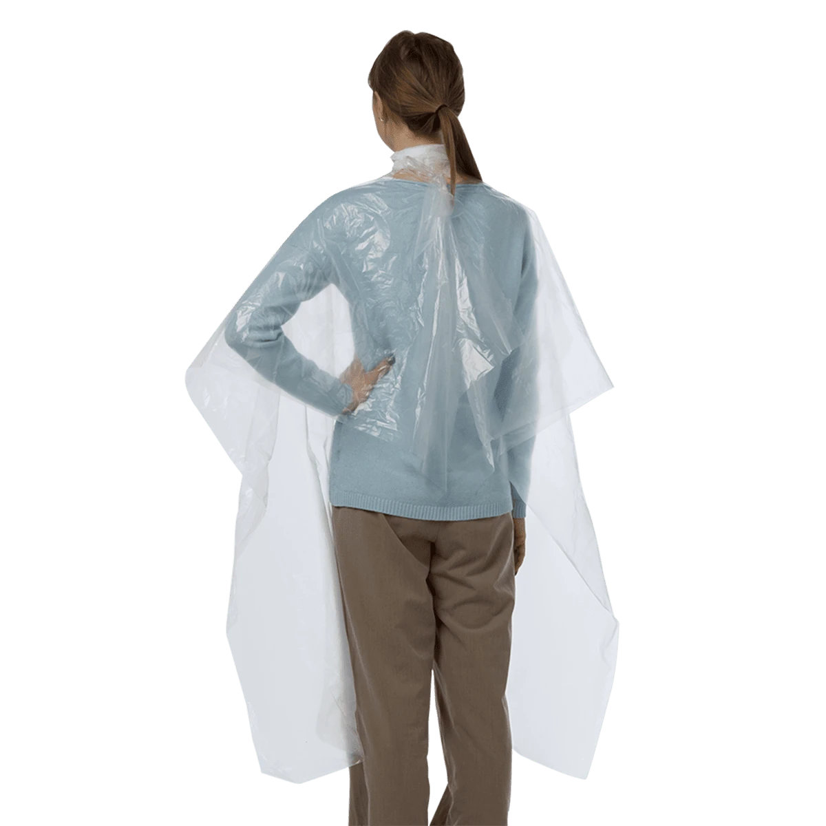 Данное изделие применяется при выполнении различных видов парикмахерских работ: стрижках, окрашиваниях и химической завивке волос. Также полиэтиленовые пеньюары могут использоваться визажистами и бровистами во время работы.