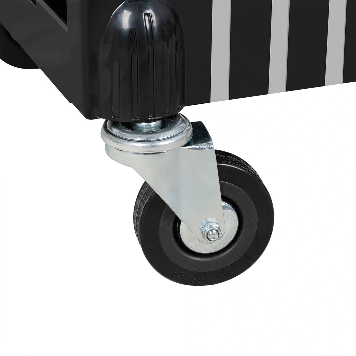Парикмахерское оборудование изготовлено из качественных материалов. Тележка установлена на прочный пластиковый каркас. Для создания полочек, ящиков, боковин с декоративными белыми линиями использован ударопрочный пластик.