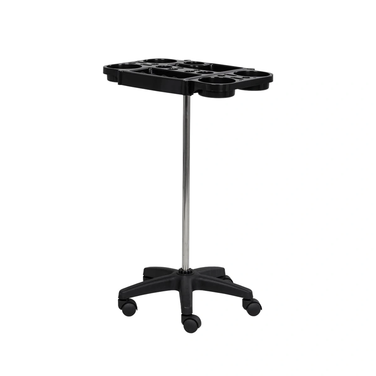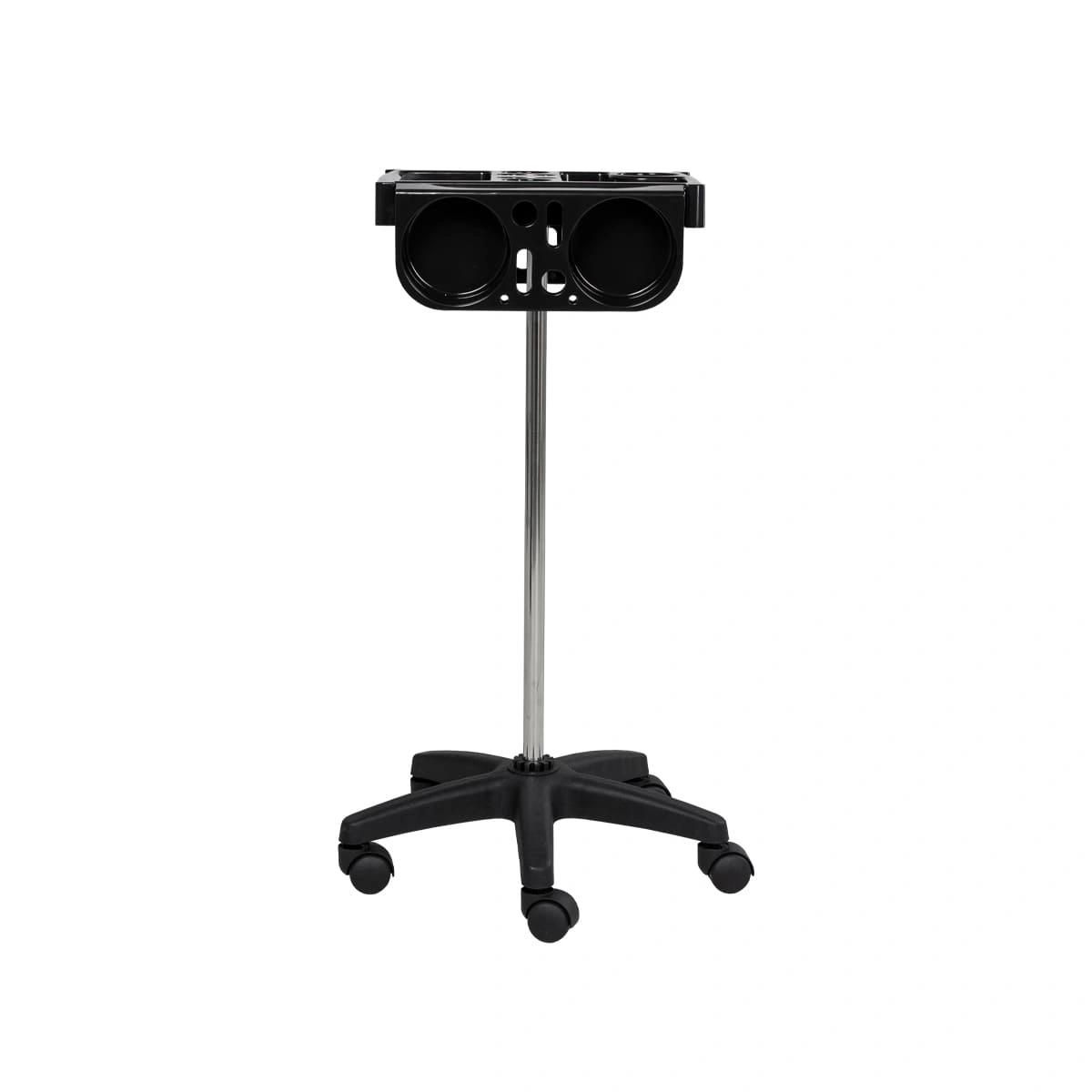 В пластиковой панели есть отверстия разного диаметра для кистей и брашеров. Для изготовления полочки использована ударопрочная пластмасса, поэтому при механических повреждениях полка не пострадает. Уход за тележкой прост. Материал оборудования устойчив к моющим и дезинфицирующим средствам, а также не деформируется от воздействия агрессивных продуктов.