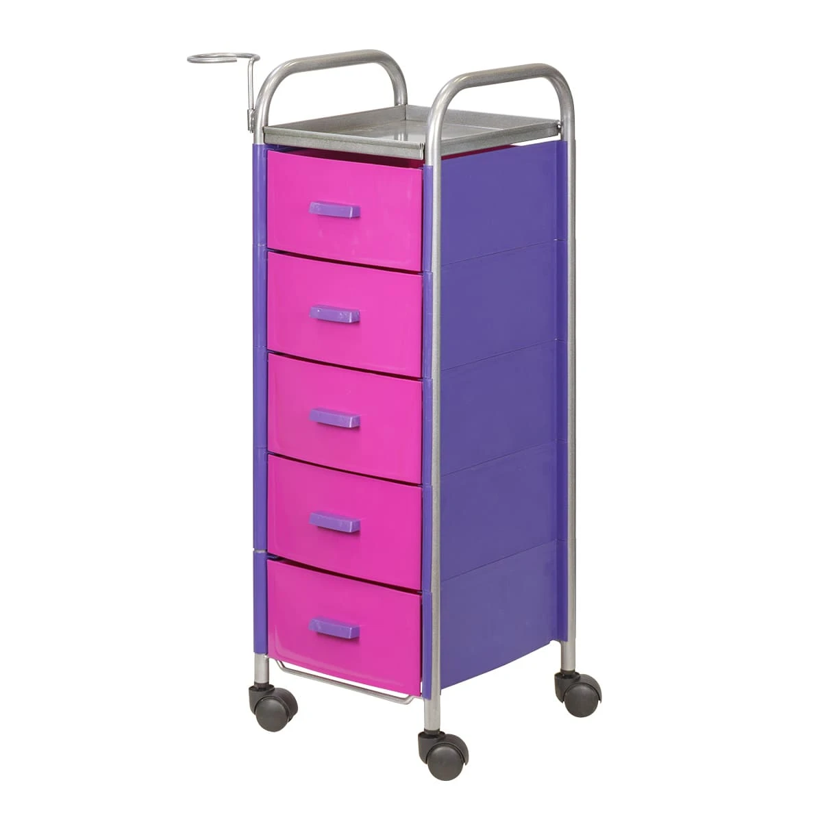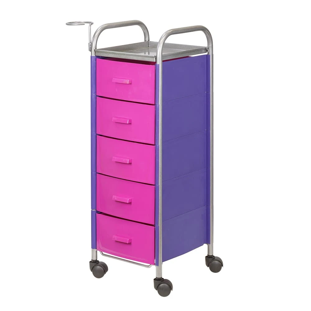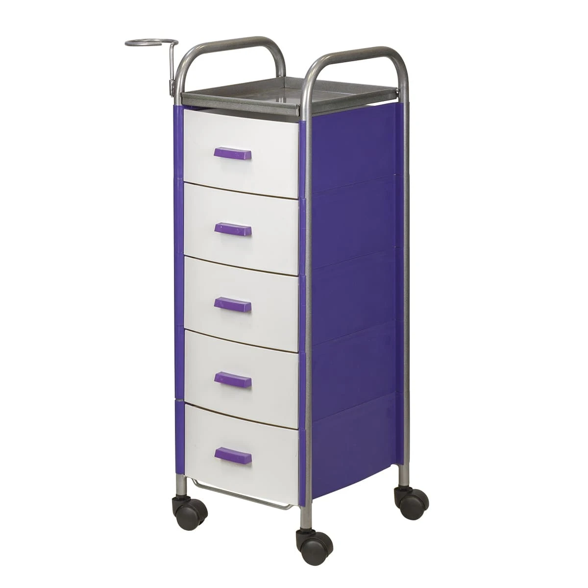 Для принадлежностей в парикмахерской тележке есть пять выдвижных ящиков. Верхняя полка позволит мастеру держать под рукой инструменты, необходимые во время работы с клиентом. На боковине установлен практичный фенодержатель. Вращающиеся колесики обеспечивают плавное и практически бесшумное перемещение оборудования в пределах рабочей зоны.