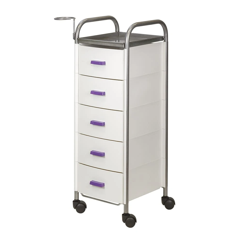 Для принадлежностей в парикмахерской тележке есть пять выдвижных ящиков. Верхняя полка позволит мастеру держать под рукой инструменты, необходимые во время работы с клиентом. На боковине установлен практичный фенодержатель. Вращающиеся колесики обеспечивают плавное и практически бесшумное перемещение оборудования в пределах рабочей зоны.