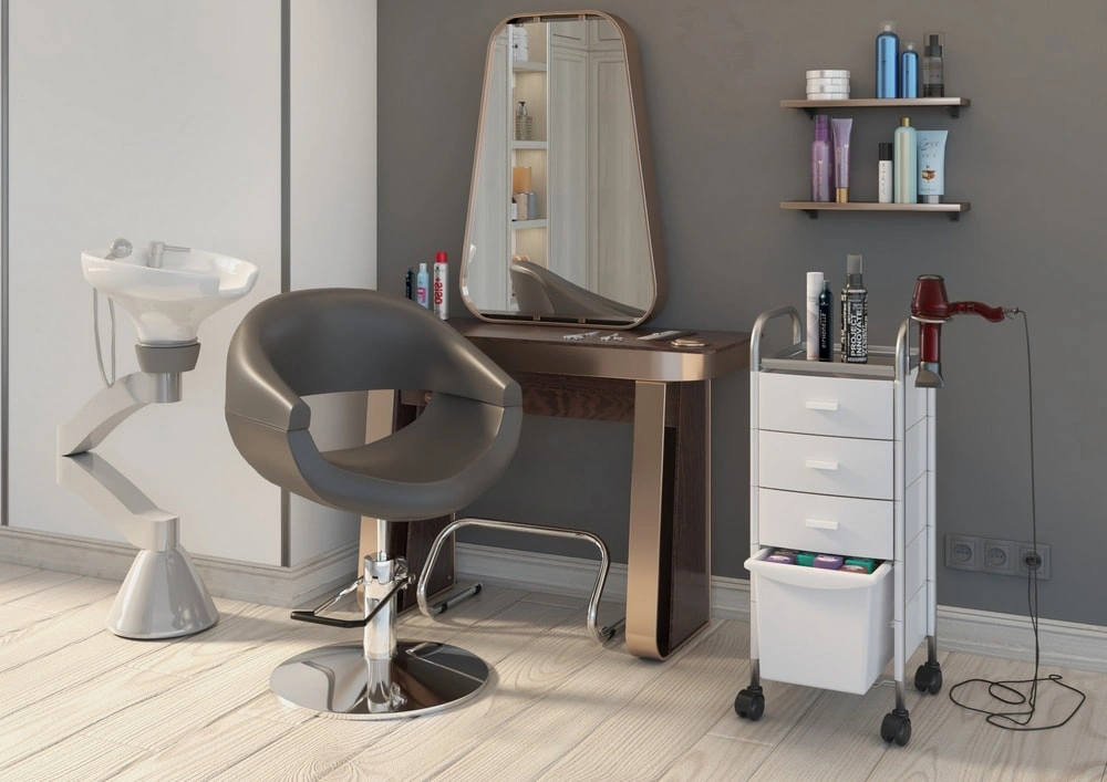 Гладкое зеркальное полотно установлено на качественной основе из многослойной фанеры. Рама выполнена из прочной хромированной стали. Для изготовления стола использована ламинированная ЛДСП. По краю столешницы и ножек есть окантовка из прочного металла. Материалы, использованные для изготовления парикмахерского оборудования, устойчивы к воздействию влаги, косметических препаратов и моющим средствам.