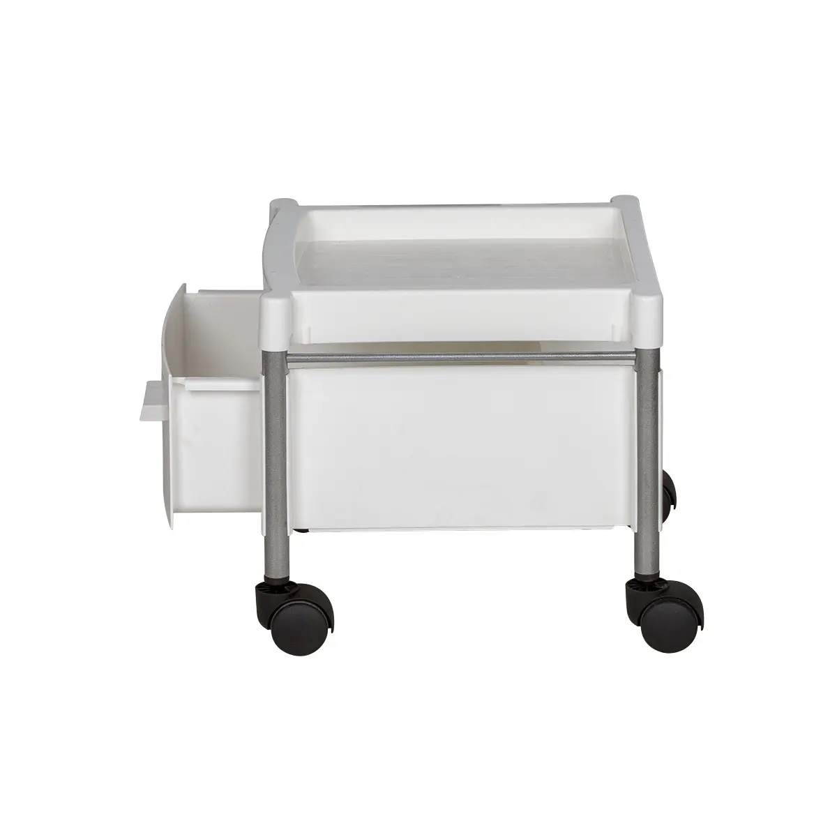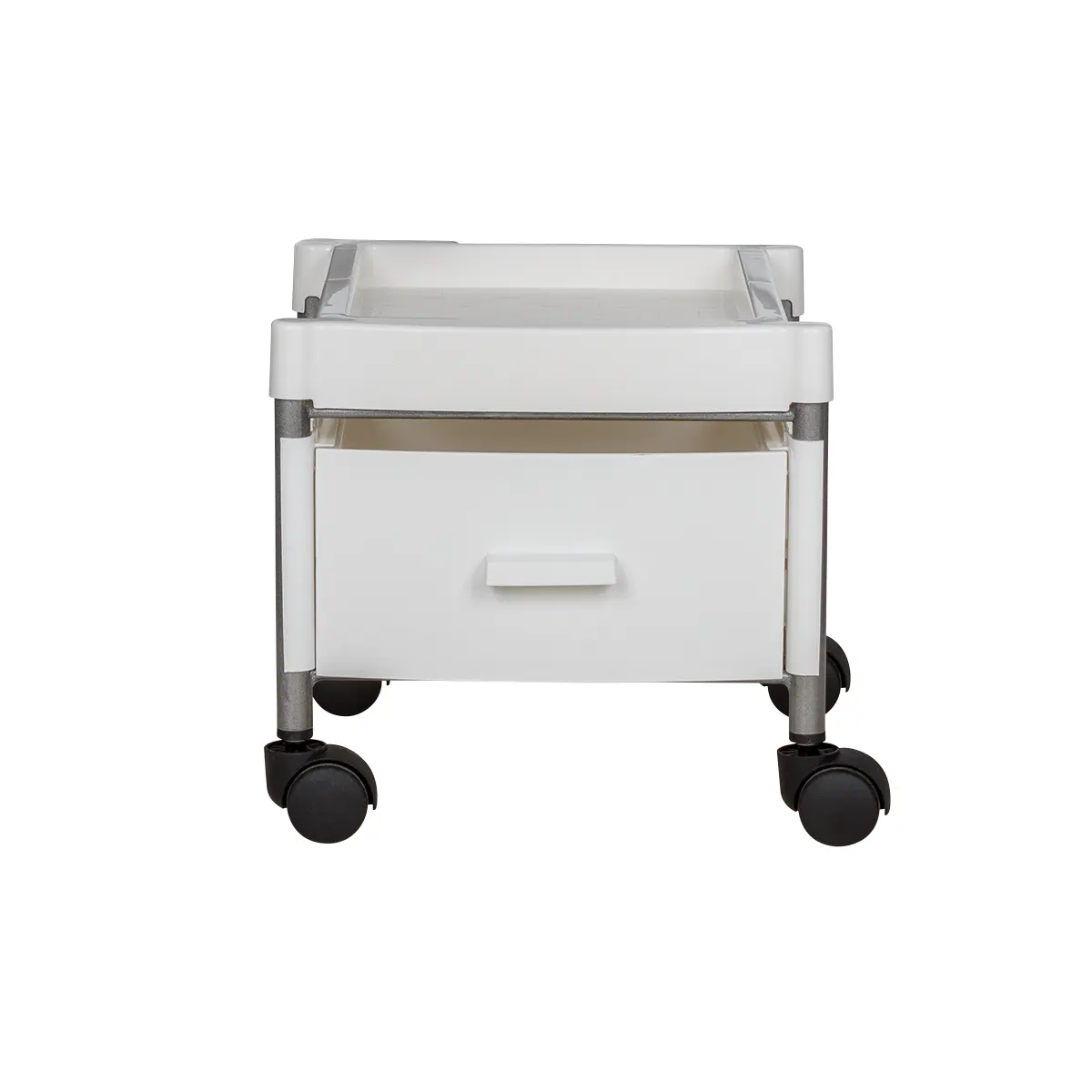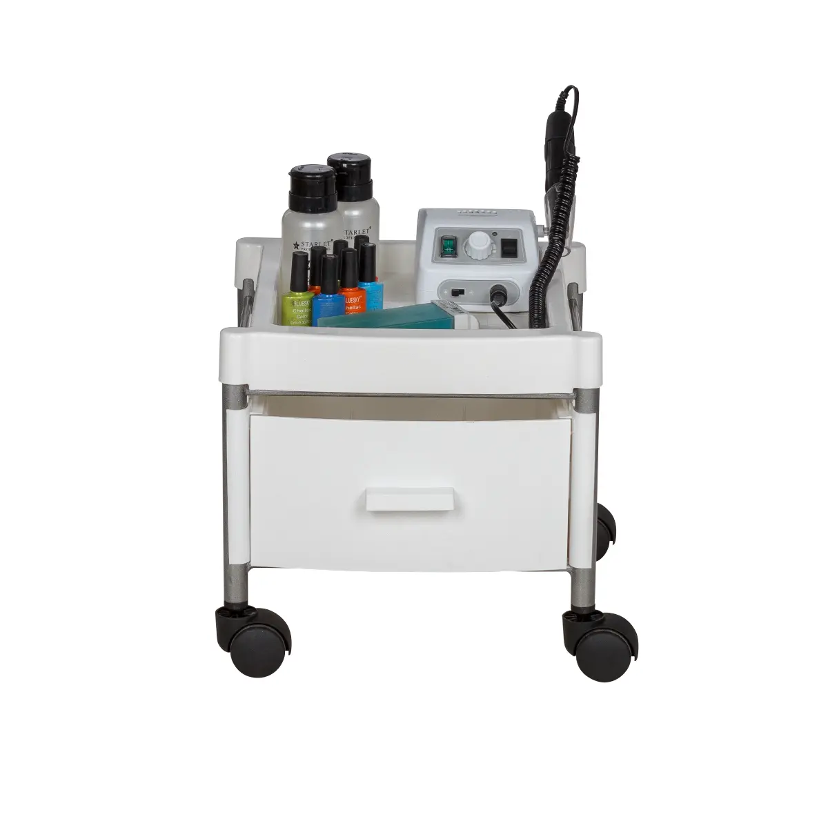 Каркас тележки – стальные трубки, надёжно защищённые от коррозии и влаги. Боковые панели, крышка и ящик выполнены из ударопрочного пластика. Материал легко очищается с помощью моющих и дезинфицирующих средств, не деформируется при случайном попадании косметических веществ. Колеса из качественного пластика не оставят ни единой царапину на полу помещения.