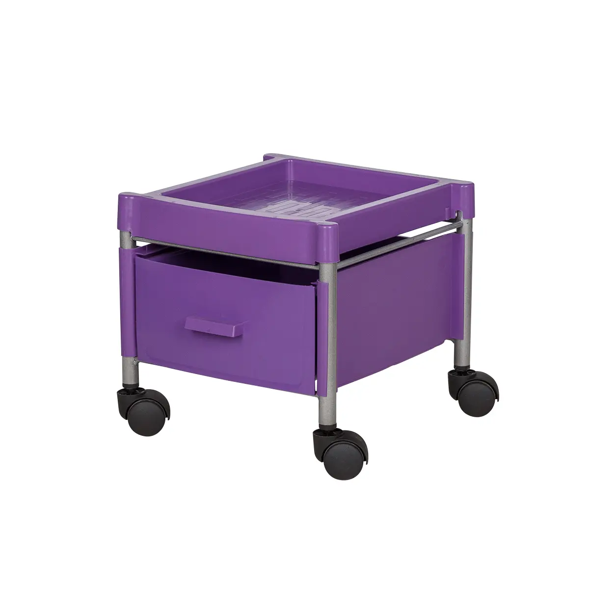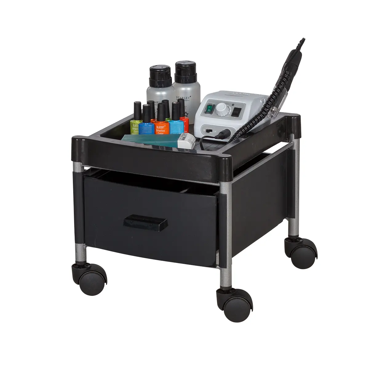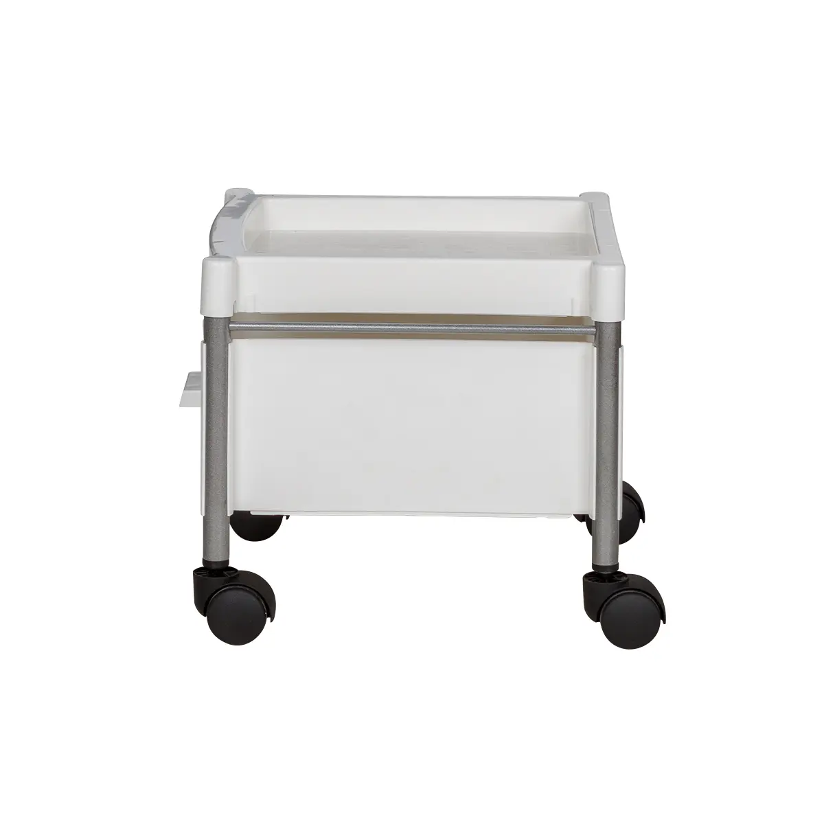 Каркас тележки – стальные трубки, надёжно защищённые от коррозии и влаги. Боковые панели, крышка и ящик выполнены из ударопрочного пластика. Материал легко очищается с помощью моющих и дезинфицирующих средств, не деформируется при случайном попадании косметических веществ. Колеса из качественного пластика не оставят ни единой царапину на полу помещения.