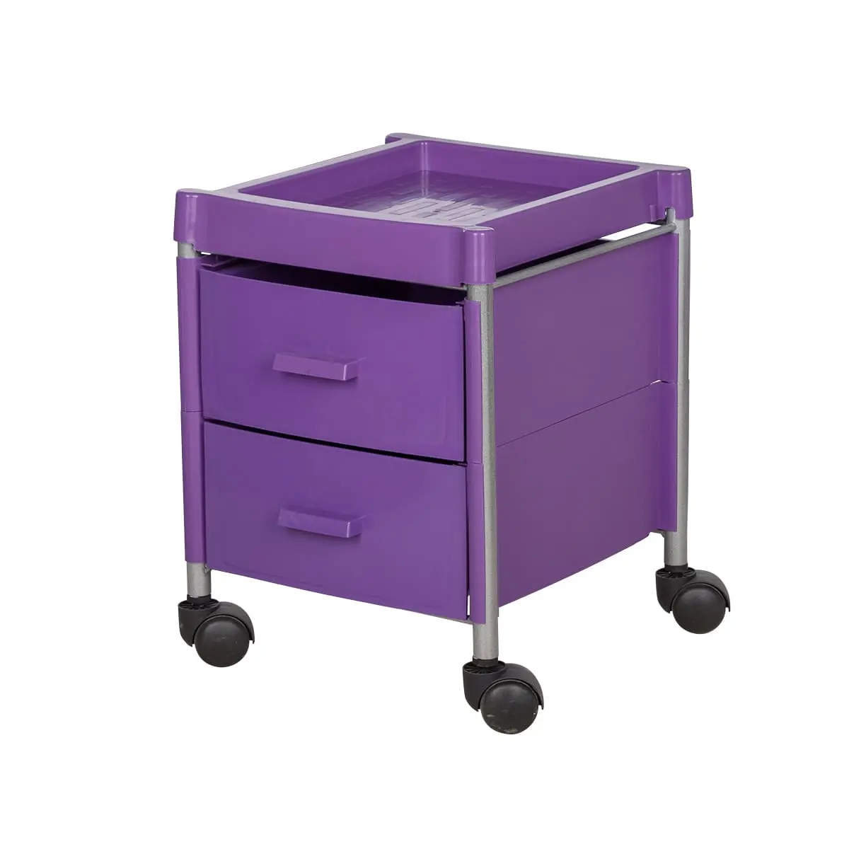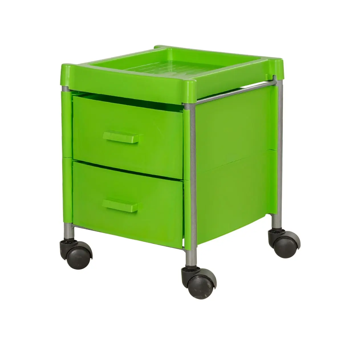 Каркас изготовлен из прочных металлических трубок. Боковые панели и ящики выполнены из качественного пластика. Износоустойчивый материал хорошо моется и очищается дезинфицирующими средствами. Верхняя полка из металла не боится влияния влаги и коррозии.