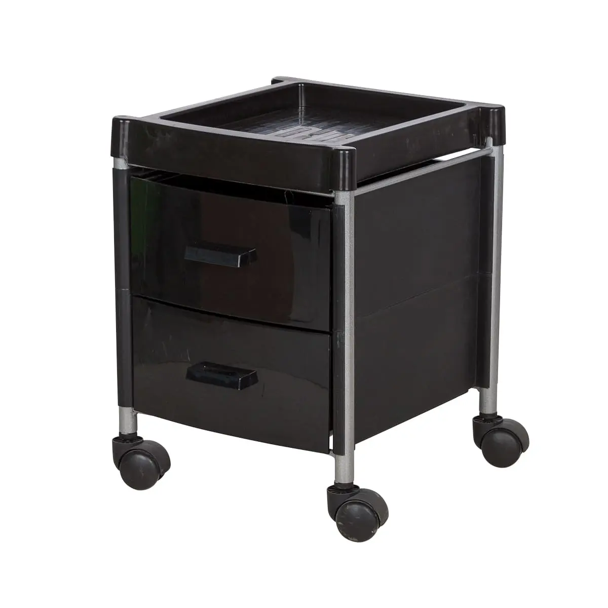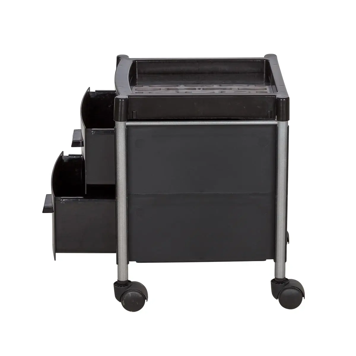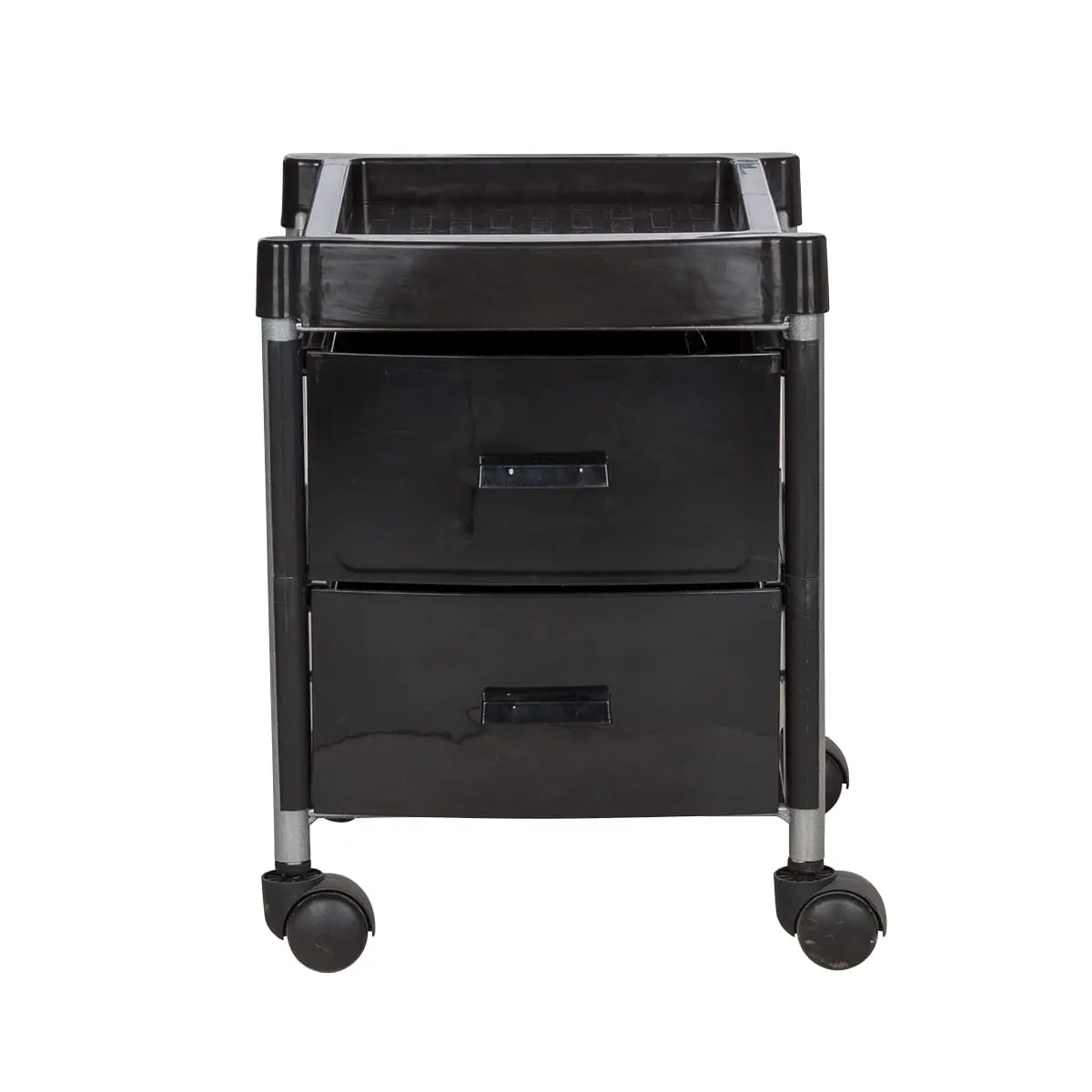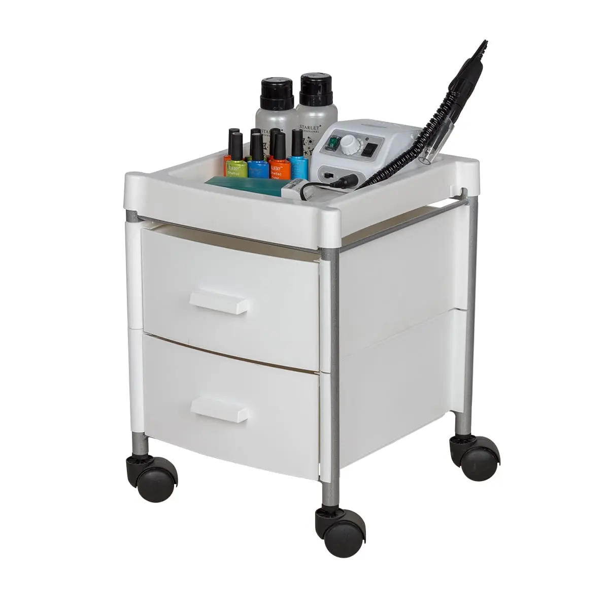 Тележка укомплектована двумя вместительными ящиками. Для инструментов, используемых во время рабочего процесса, на тележке предусмотрена крышка. Для быстрого и бесшумного перемещения, тележка для педикюра оснащена четырьмя поворотными колесами. Благодаря компактным размерам тележка может быть использована даже в небольшом кабинете.